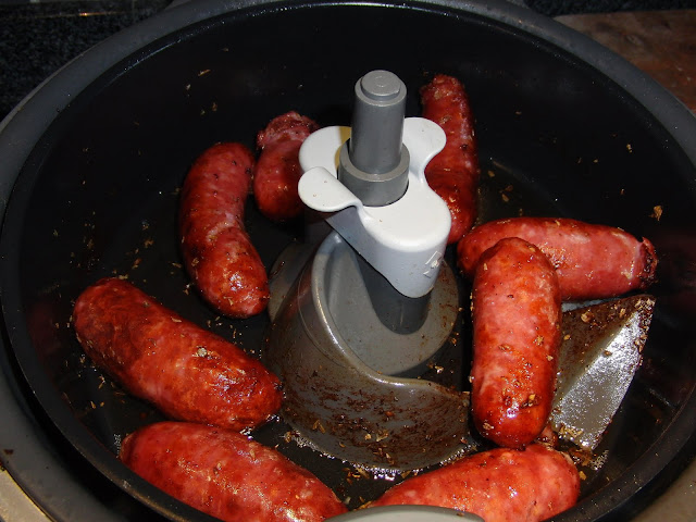 Colocar na actifry as salsichas, temperar com pimenta e oregãos, colocar o azeite por cima, programar 20 minutos e ligar a máquina.