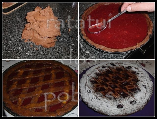 Para elaborar o recheio, misture a compota com o sumo do limão. Com este preparado, cubra a base da tarte. Coloque o resto da massa sobre uma mesa polvilhada de farinha, tenda-a com o rolo e, com uma carretilha, corte umas tiras de massa com 0,5 cm de largura. Disponha-as em forma de rede por cima do recheio da tarte. Pincele a borda e o entrançado com a gema de ovo. Leve a cozer ao forno previamente aquecido (200ºC) durante 40 min. Retire a tarte do forno, deixe-a repousar durante alguns minutos na forma, desenforme-a sobre uma rede de cozinha e deixe-a arrefecer. Polvilhe com açúcar em pó.